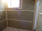 Die Isolierung besteht aus handelsüblicher Mineralwolle und ist 60 cm breit (was mir den Abstand zwischen den 4-kant Hölzer vorgegeben hat)